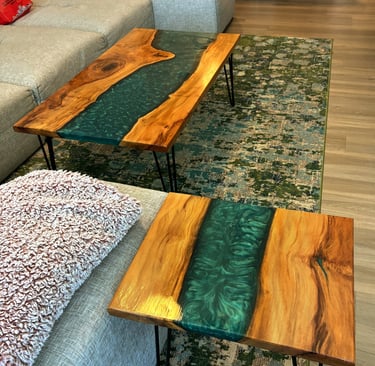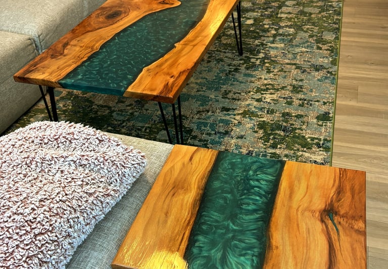 Custom live-edge coffee, dining, end and sofa tables showcasing natural wood and epoxy artistry